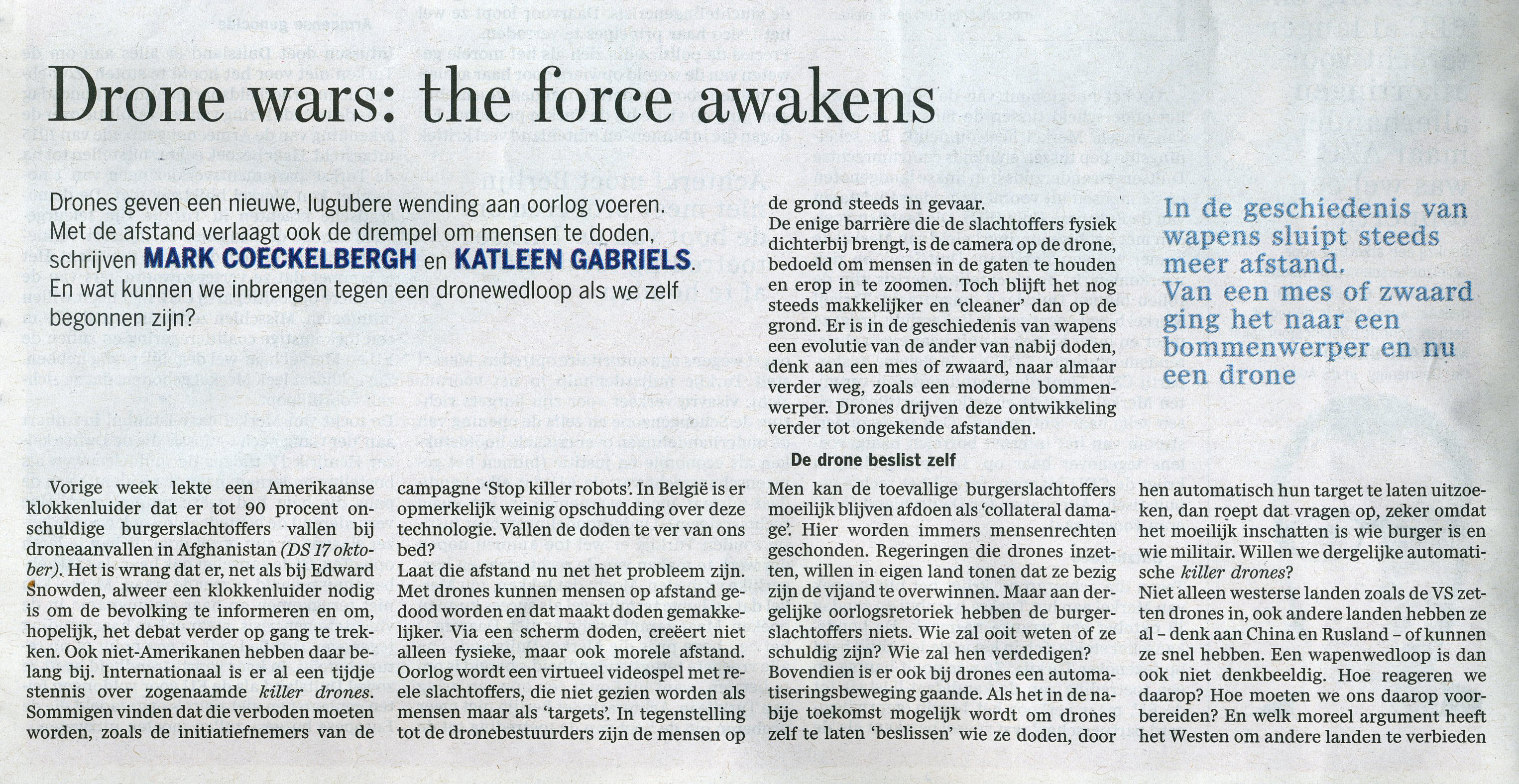 Coeckelbergh, M.and Gabriels, K. ‘Drone wars: The force awakens‘ in De Standaard, 20 October 2015 pdfpart1 pdfpart2