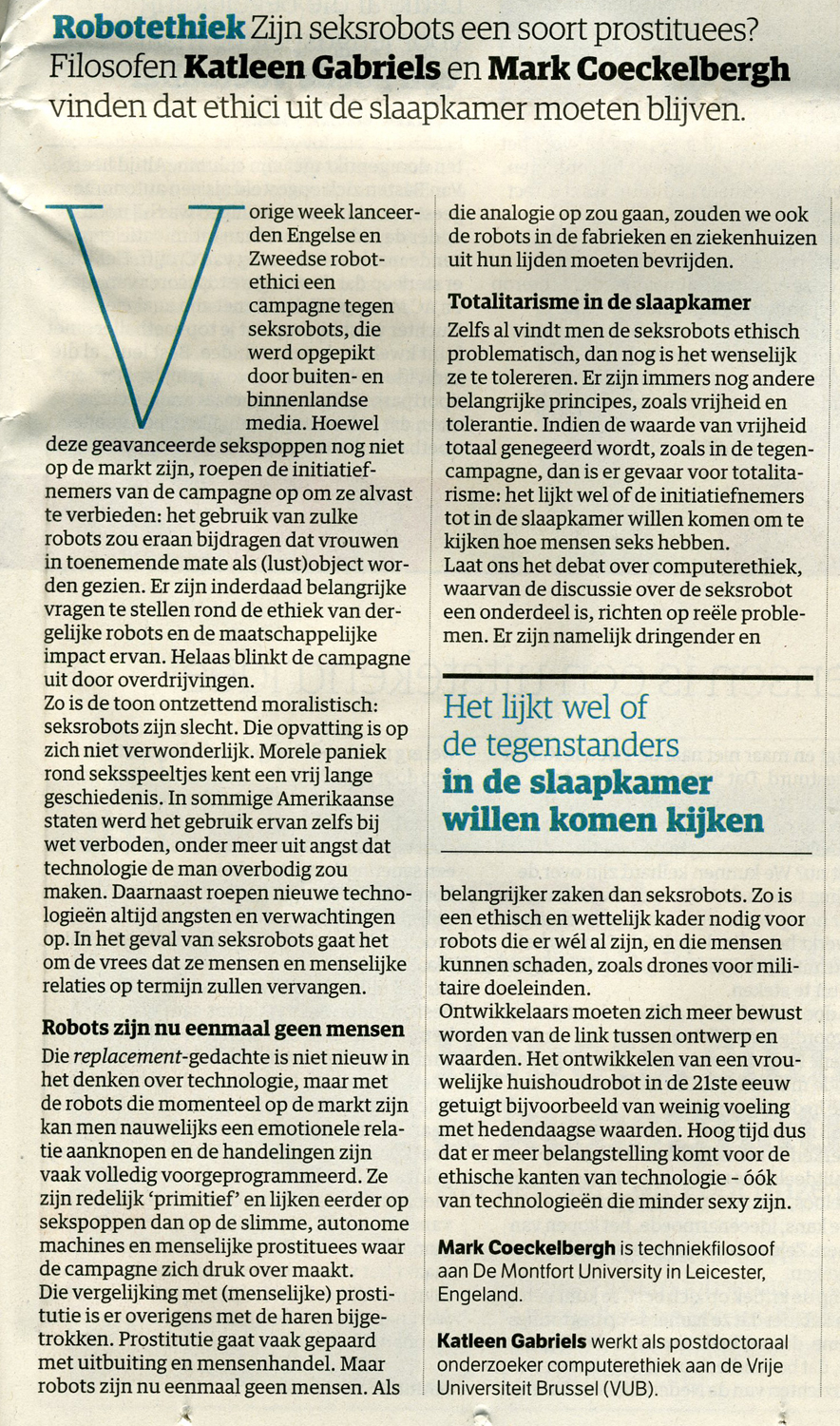 Gabriels, K. and Coeckelbergh, M. ‘Niets mis met een robot in bed‘ in NRC.Next, 26 September 2015 pdf