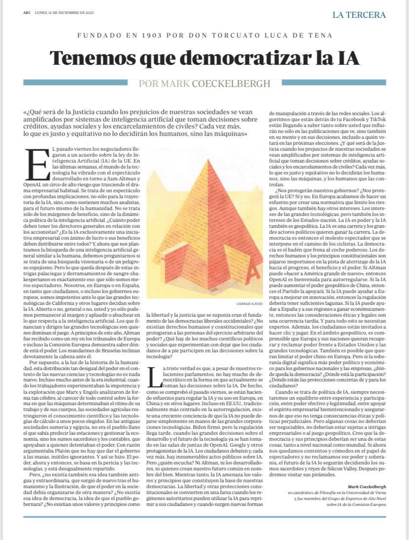 Coeckelbergh, M. 2023. Tenemos que democratizar la IA. Contribution invited by ABC. 10 December 2023. [file]